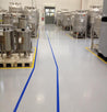 Le marquage au sol bleu est utilisé pour stocker les produits (matières premières, produits en cours de fabrication ou produits finis), il sert également à baliser les accès obligatoires. En effet, dans une entreprise manipulant des produits chimiques, les voies de circulation doivent être encadrées et scrupuleusement respectées.